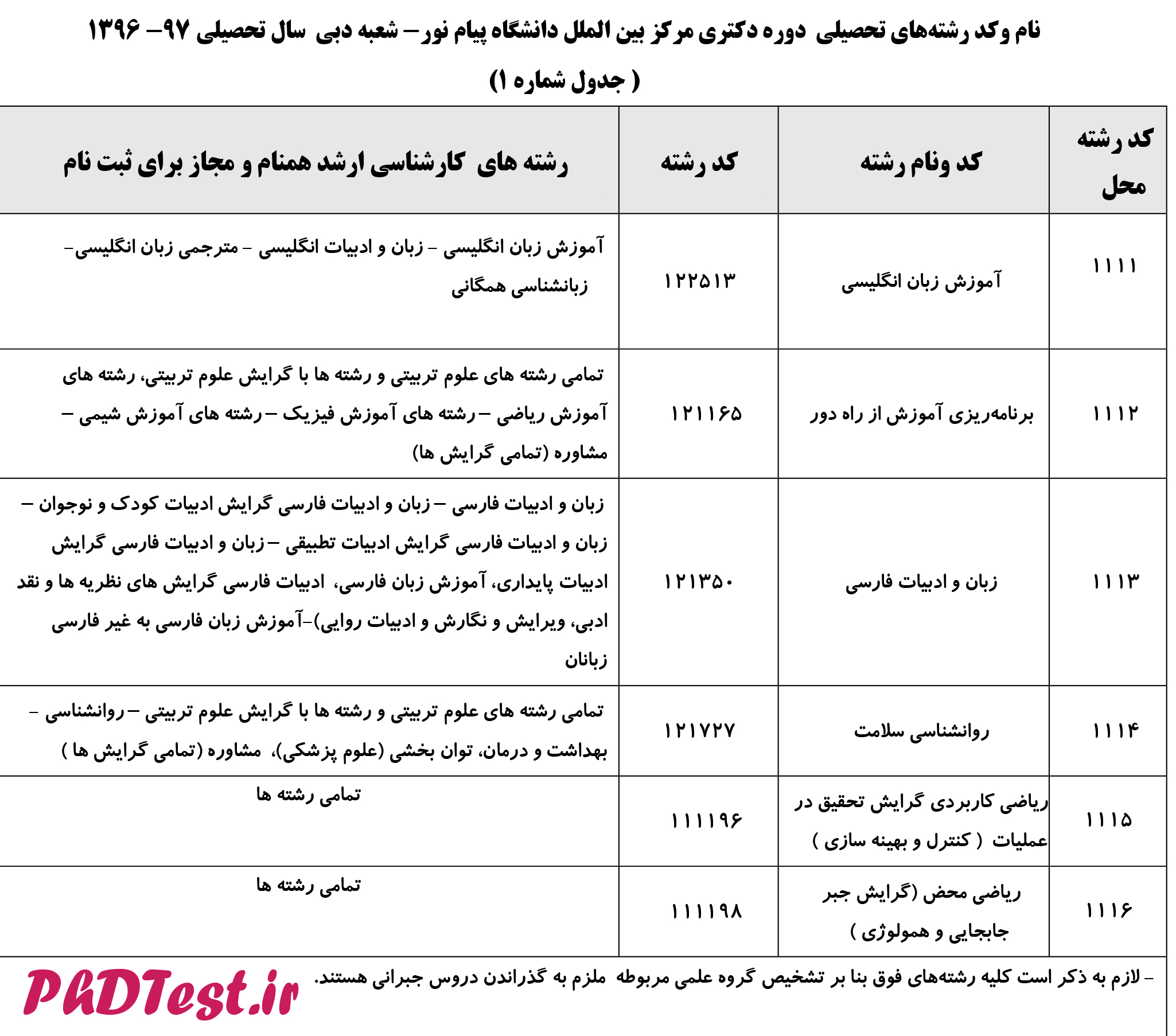 اعلام رشتههای دارای پذیرش دکتری ۹۶ شعبه دبی دانشگاه پیام نور
