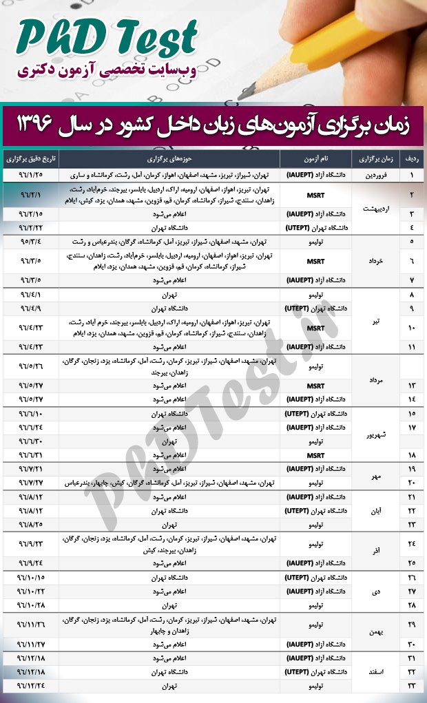 زمان برگزاری آزمونهای زبان داخل کشور در سال ۱۳۹۶