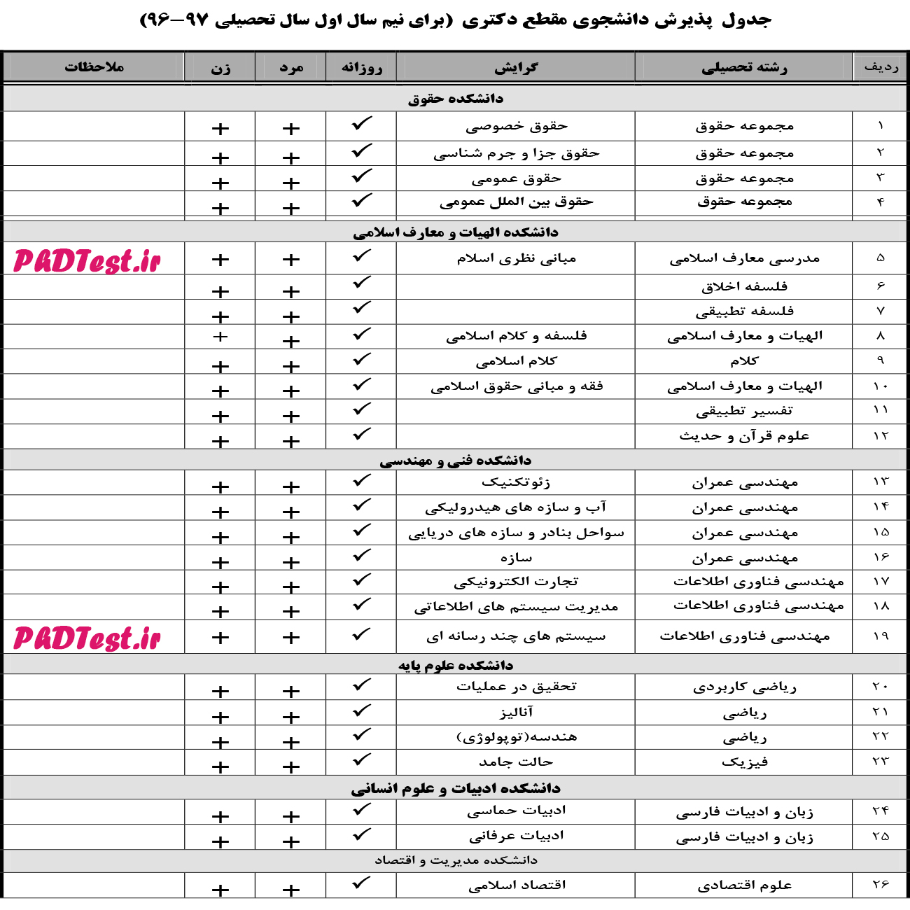 به گزارش پی اچ دی تست، دانشگاه قم از میان داوطلبان واجد شرایط پذیرش بدون ازمون مقطع دکتری در رشته‌های جدول ذیل، برای سال ۱۳۹۶ دانشجو پذیرش می پذیرد.