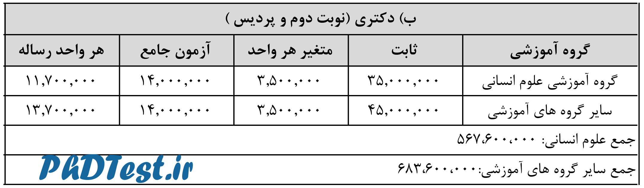 به گزارش پی اچ دی تست، مطابق مصوبات هیات امنای دانشگاه امام خمینی قزوین، شهریه دانشجویان نوبت دوم (شبانه) و پردیس در مقطع دکتری به شرح جدول ذیل است:
