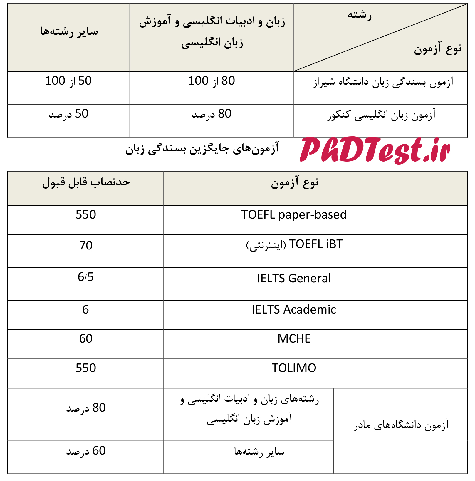 - در صورت عدم ارائه نمره قابل قبول زبان انگلیسی در زمان آزمون شفاهی، پذیرفته شدگان موظفند تا قبل از آزمون جامع، نسبت به ارائه نمره قابل قبول اقدام نماید.
