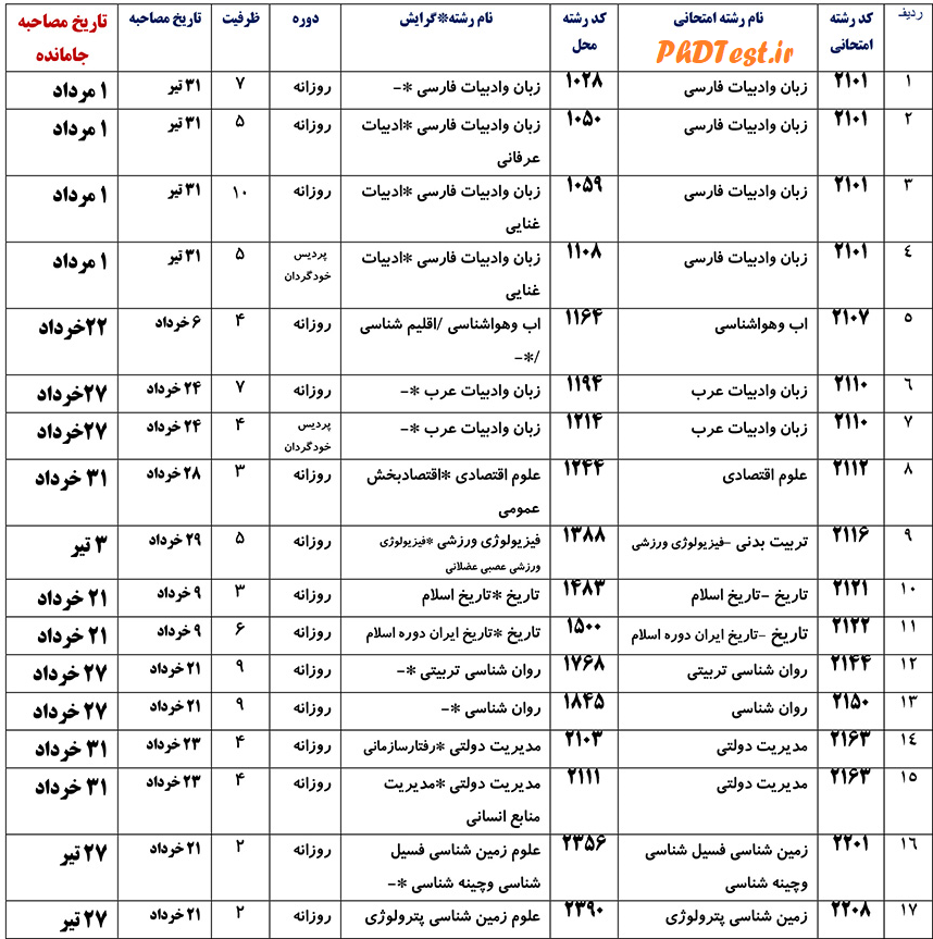 به گزارش پی اچ دی تست، بنا بر اعلام دانشگاه لرستان، تاریخ مصاحبه آن دسته از داوطلبانی که حائز حد نصابهای اعلام شده از طرف دانشگاه لرستان بودند، ولی به هر دلیلی نتوانسته اند در موعد مقرر در آزمون مصاحبه تخصصی شرکت نمایند، در کد رشته محل های مختلف بر اساس جدول زیر می باشد. بدیهی است عدم حضور در زمان مقرر به منزله انصراف از مصاحبه تخصصی بوده و به هیچ عنوان تمدید نخواهد شد.