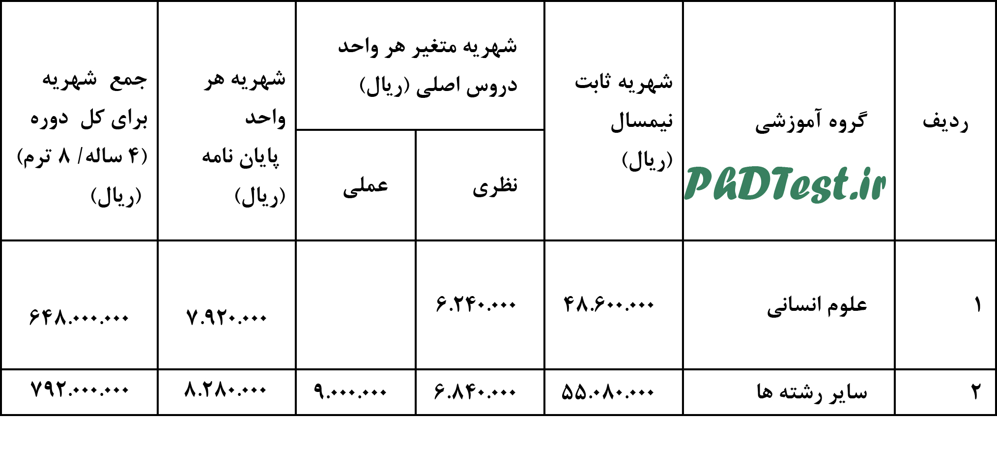 جدول شهریه دانشجویان مقطع دکتری نوبت دوم و پردیس دانشگاهی سال تحصیلی ۹۷-۹۶