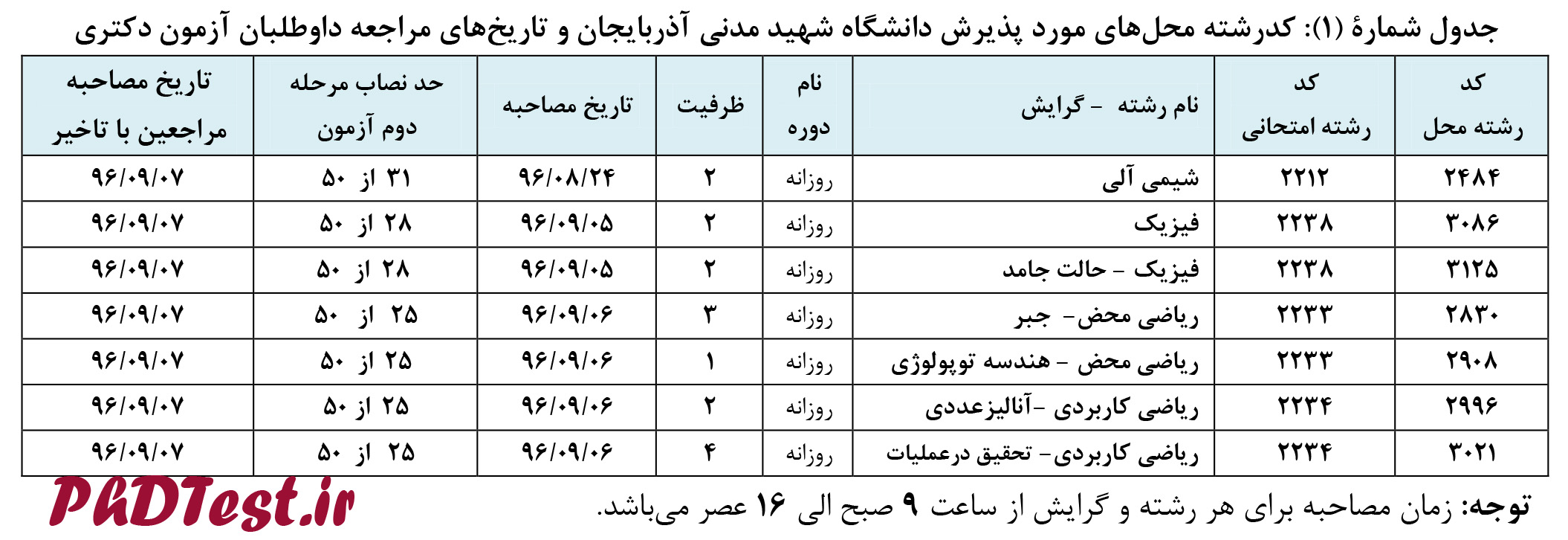 داوطلبانی که در مرحله اول آزمون دکتری شرکت نموده و از طریق سازمان سنجش جهت شرکت در مصاحبه علمی تکمیل ظرفیت به این دانشگاه معرفی شده اند، لازم است بر اساس برنامه زمانی اعلام شده در این اطلاعیه، به این دانشگاه مراجعه نمایند.اجرای مرحله دوم آزمون دکتری – مصاحبهٔ علمی و سنجش عملی- در دانشگاه شهید مدنی آذربایجان صرفاً بصورت شفاهی برگزار میگردد. کد رشته محل های مورد پذیرش این دانشگاه همراه با تاریخ های مراجعه داوطلبان آزمون دکتری جهت انجام مصاحبه در جدول شمارهٔ (۱) ارائه شده است.