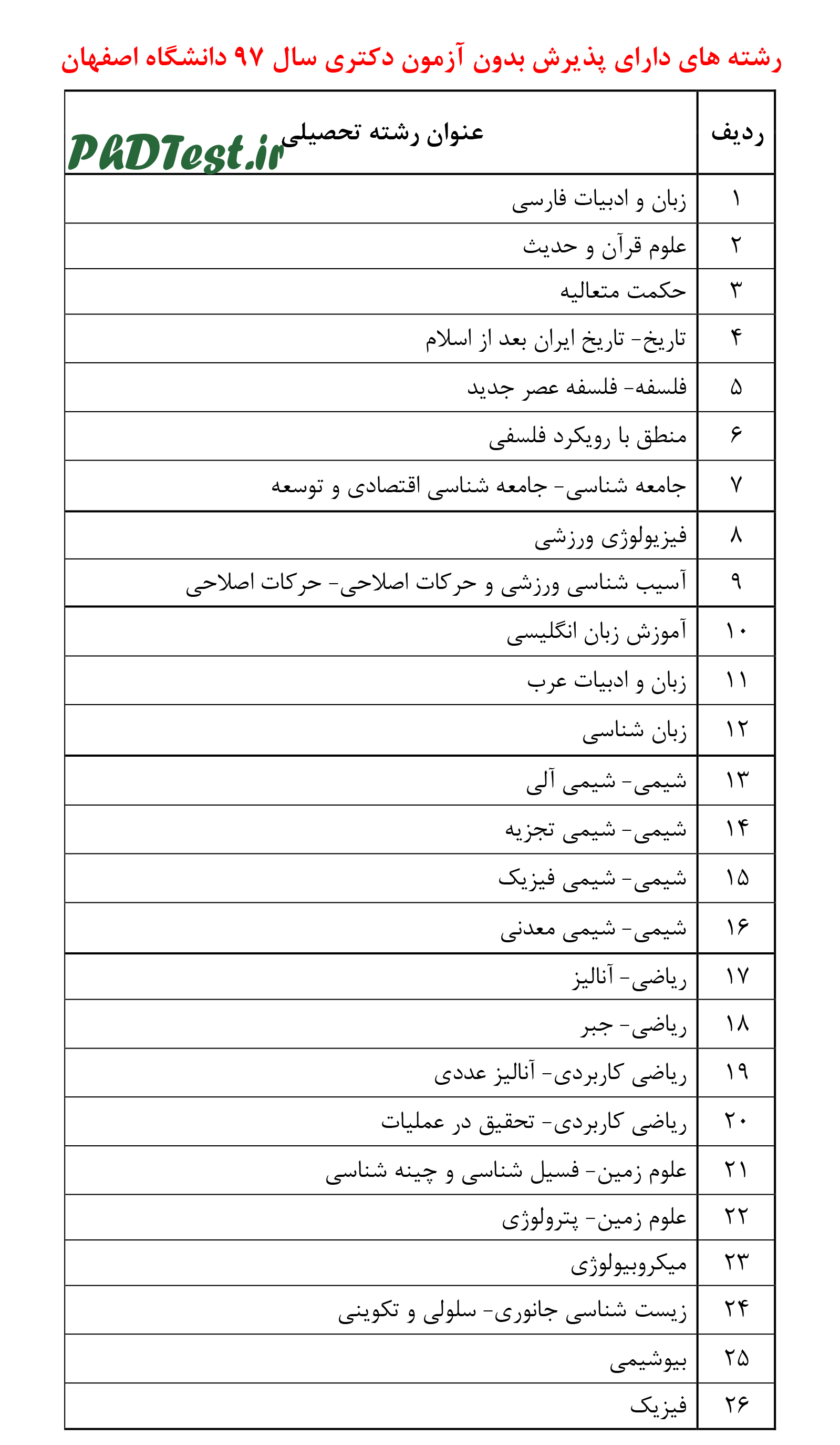 انتشار فهرست رشتههای دارای پذیرش دکتری بدون کنکور 97 دانشگاه اصفهان