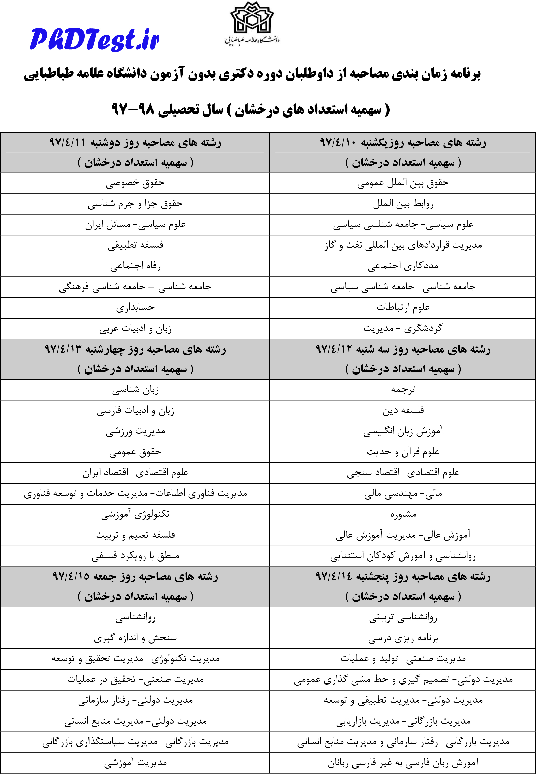 نتایج اولیه معرفی شدگان و برنامه زمان بندی مصاحبه دکتری بدون آزمون سال 1397 دانشگاه علامه طباطبایی اعلام شد.