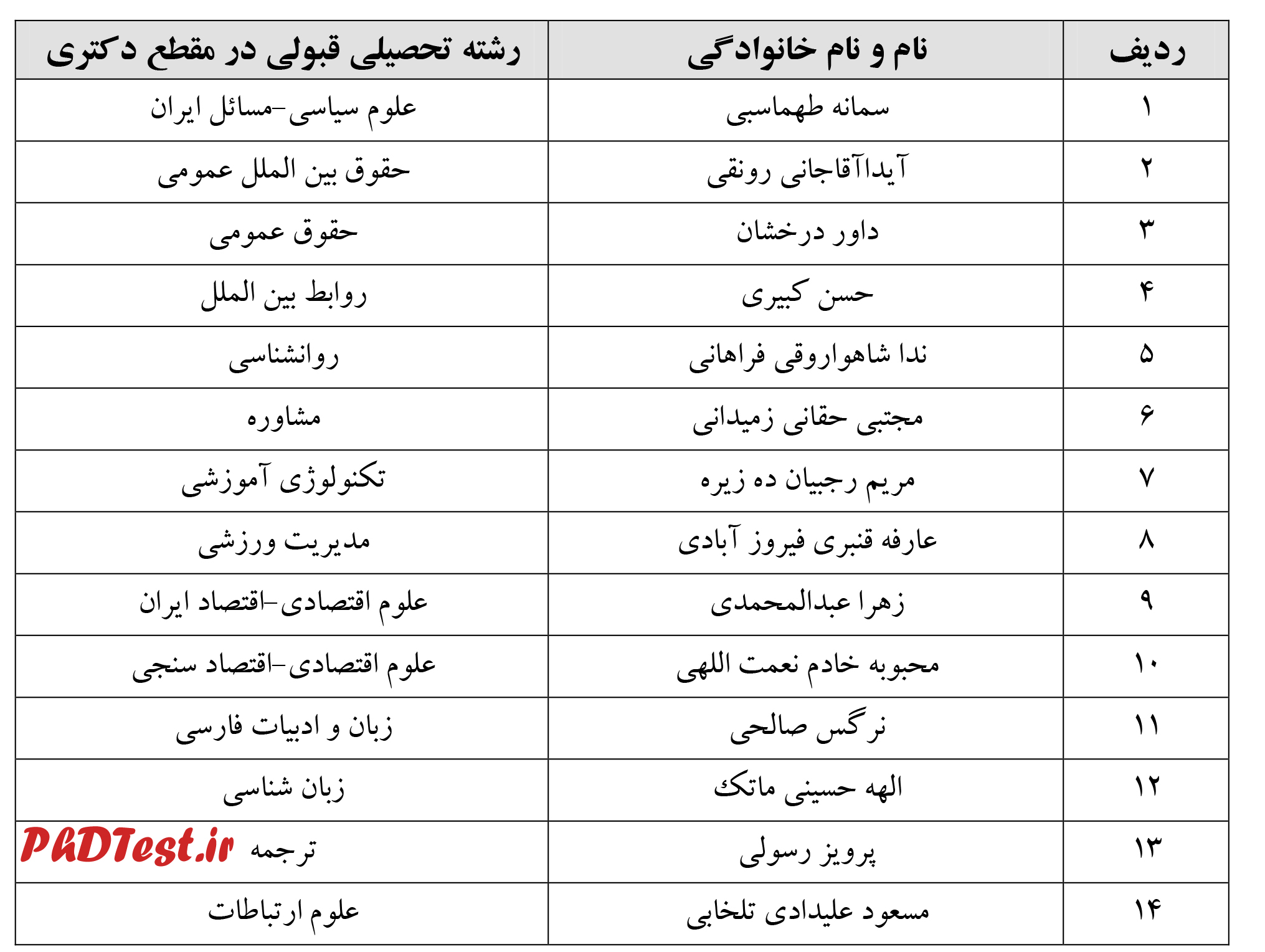 - داوطلبان مابقی رشته های دوره دکتری (که در جدول نیامده)، موفق به کسب حد نصاب لازم نشده و پذیرفته نشده اند.