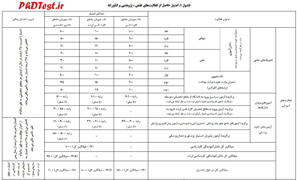 شیوه نامه اعطای جایزه های تحصیلی به دانشجویان صاحب استعداد برتر از سوی بنیاد نخبگان ابلاغ و در این شیوه نامه میزان امتیاز هر فعالیت مشخص شده است.