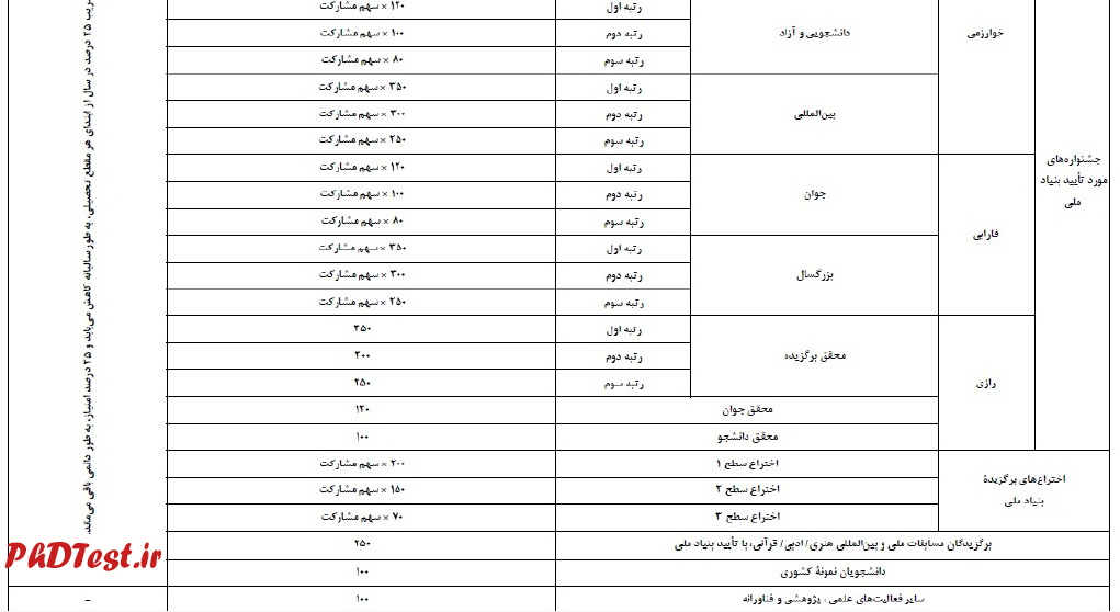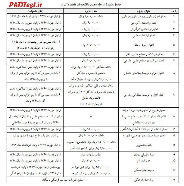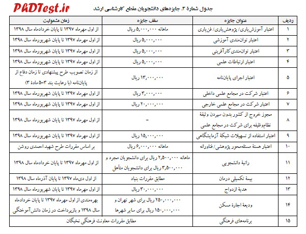 جایزههای دانشجویان مقطع کارشناسی ارشد بر اساس جدول شماره 3 و دانشجویان مقطع دکتری بر اساس جدول شماره 4 به مشمولان اعطا میشود.