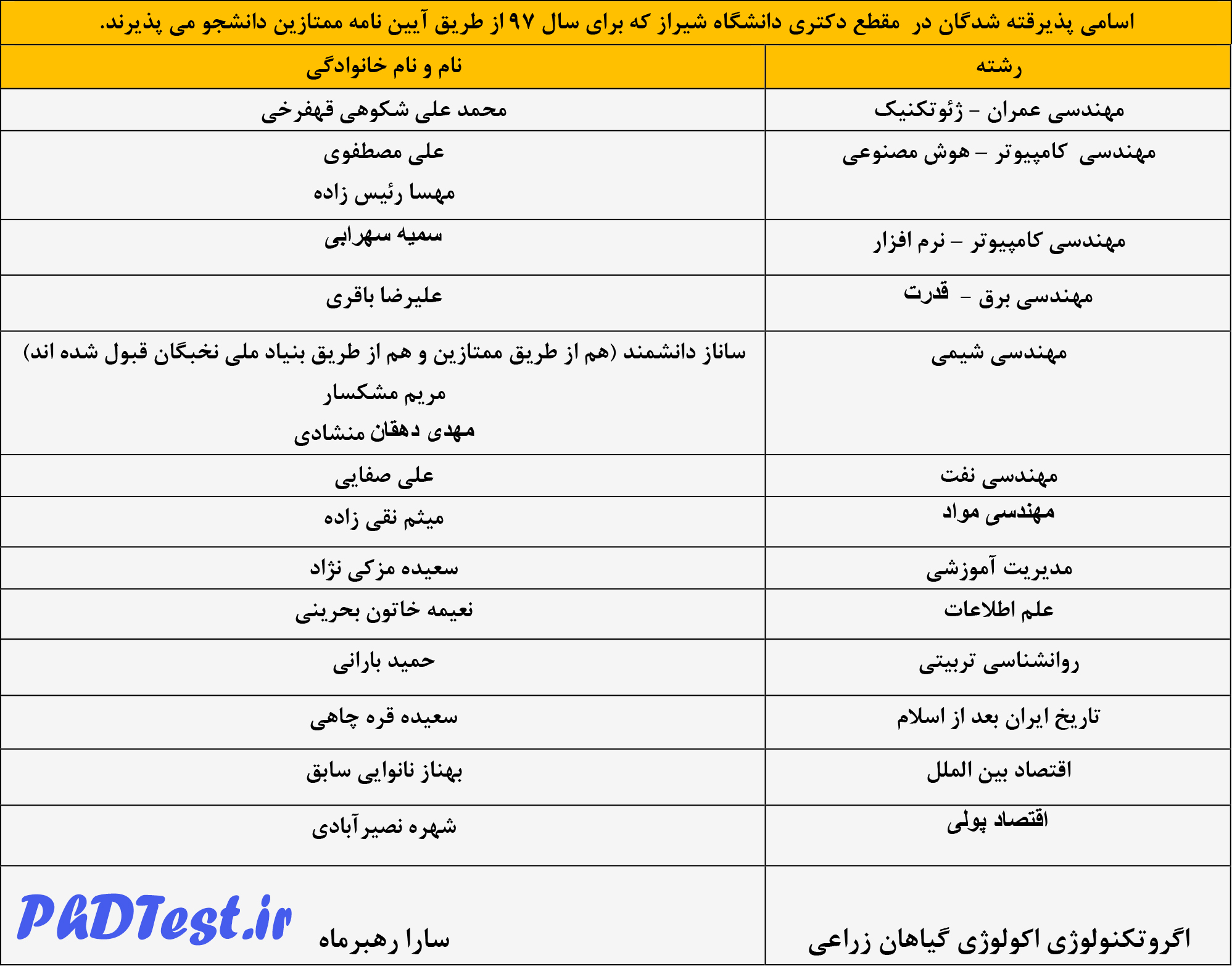 اسامی پذیرفته شدگان دکتری بدون آزمون سال تحصیلی 97-98 دانشگاه شیراز منتشر شد.