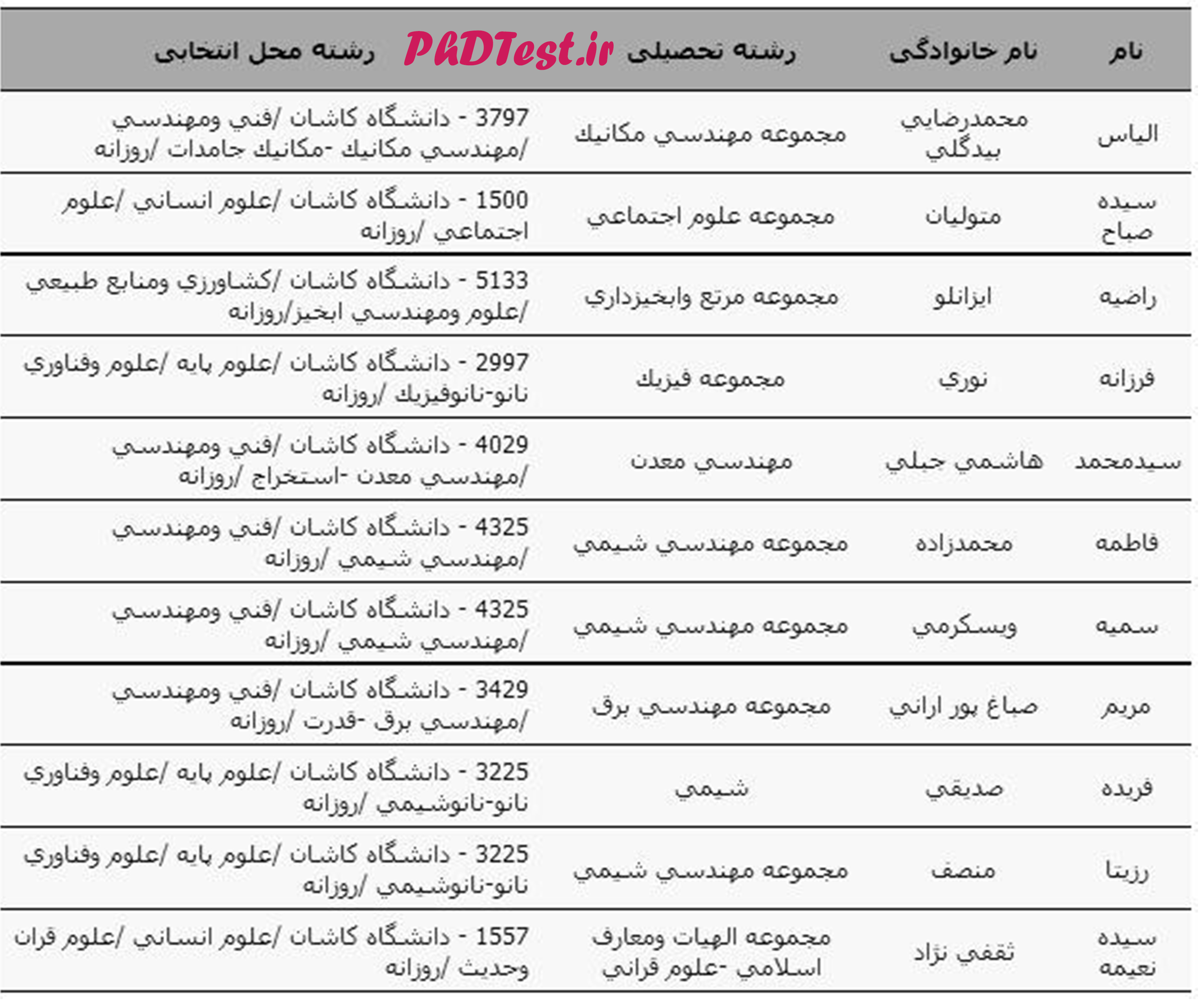به گزارش پی اچ دی تست، اسامی پذیرفته شدگان اولیه دکتری بدون آزمون سال تحصیلی 97-98 دانشگاه کاشان به شرح ذیل می باشد: