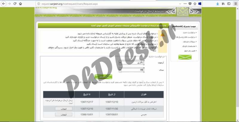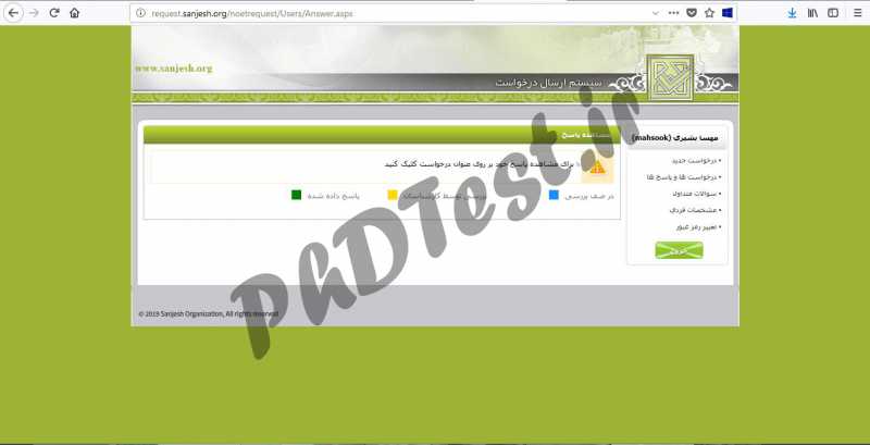 جهت اعتراض به پاسخنامه کلیدی سوالات دکتری 98، لازم است به سایت سازمان سنجش آموزش کشور مراجعه کنید و از منوی سمت چپ، وارد «سیستم پاسخگویی» سایت سازمان سنجش شود.