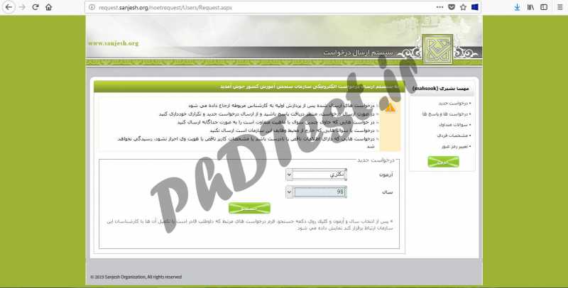 سپس با انتخاب «دکتری» در بخش آزمون و «98» در بخش سال، روی عبارت «جستجو» کلیک کنید تا بتوانید گزینه اعتراض به کلید سوالات دکتری 98 را انتخاب کنید.