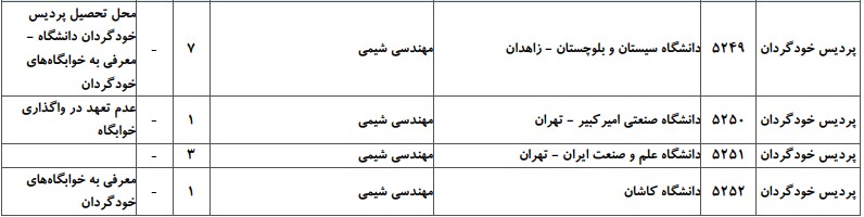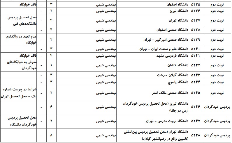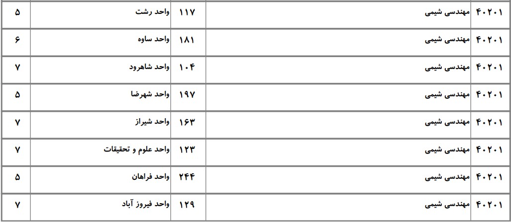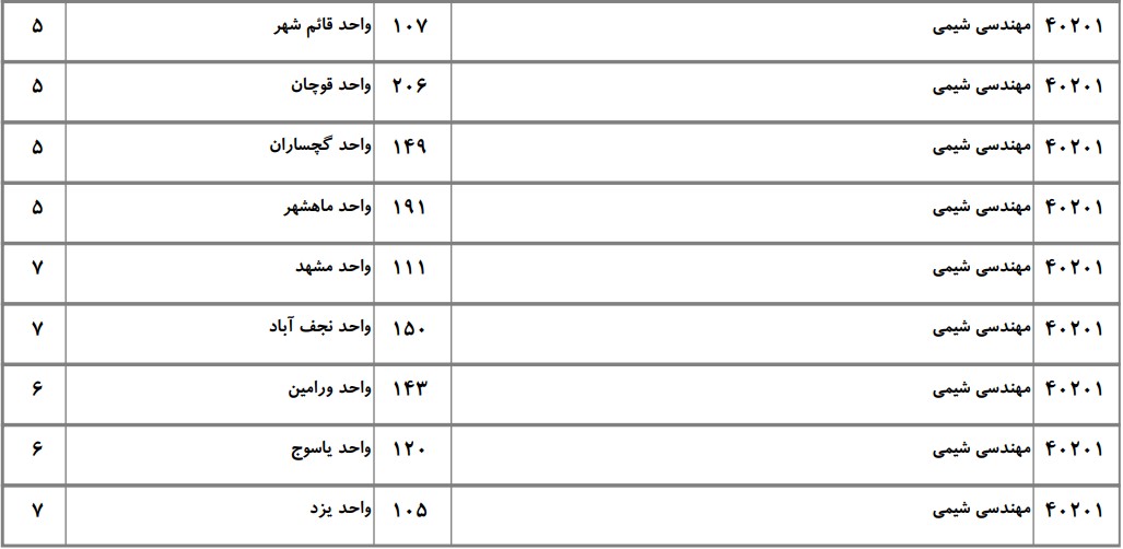 با توجه به این که تغییرات دانشگاههای پذیرنده یک رشته در مقطع دکتری در سالهای مختلف تغییرات زیادی ندارد، دانشگاههای جداول زیر که مربوط به آزمون دکتری سال گذشته است، میتواند به داوطلبان عزیز جهت اطلاع از گرایشهای دکتری مهندسی شیمی و نیز دانشگاههایی که در دورههای مختلف روزانه، شبانه، پردیس، غیرانتفاعی، پیام نور و دانشگاه آزاد اﺳﻼمی در رشته مهندسی شیمی پذیرش دارند، کمک کند.