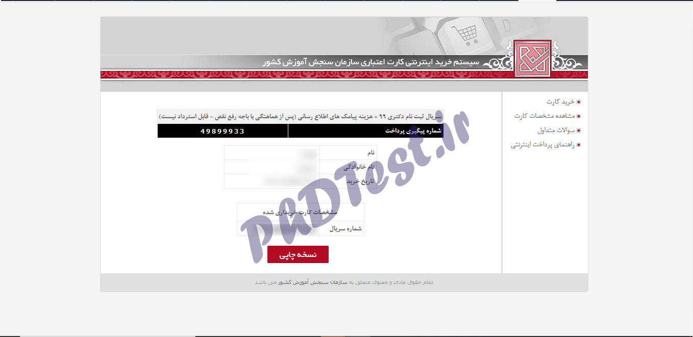 4. پس از پرداخت اینترنتی (که برای آن نیاز به رمز اینترنتی دارید)، شماره سریال خود را دریافت کنید و یادداشت نمایید.