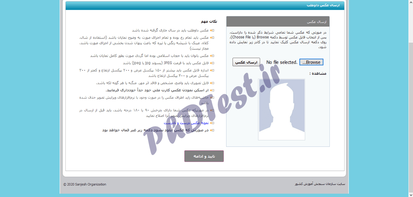 6. سپس عکس پرسنلی خود را مطابق با مشخصاتی که گفته شده در سایت اپلود کنید، بر روی گزینه ارسال عکس کلیک کنید و سپس روی گزینه «تایید و ادامه» کلیک کنید.