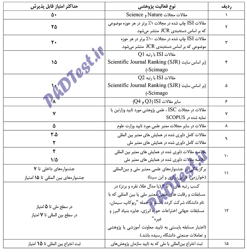 ج) کسب حداقل ۶۰ امتیاز از فعالیتهای آموزشی، پژوهشی و مصاحبه مطابق آیین نامه دکتری استعداد درخشان الزامی است.