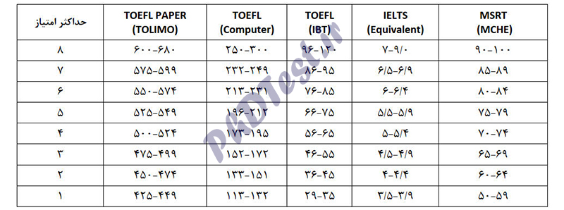 جدول ۴- همترازی نمرات آزمون های ملی و بین المللی زبان انگلیسی