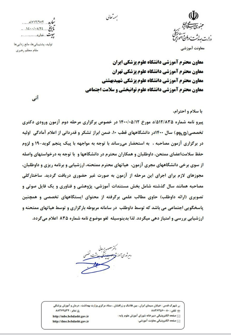 به گزارش پی اچ دی تست، نامه ای در فضای مجازی منتشر شده است که بر اساس آن از دانشگاه های زیرمجموعه وزارت بهداشت، درمان و آموزش پزشکی خواسته شده تا مصاحبه های حضوری دکتری 1400 را لغو کرده و ارزیابی داوطلبان را همانند سال گذشته بر مبنای مستندات آموزشی، پژوهشی و فناوری و یک فایل صوتی و تصویری (ارائه داوطلب) حاوی مطالب علمی برگرفته از محتوای ایستگاه های تخصصی و همچنین پاسخگویی اجتماعی باشد که توسط داوطلب در سامانه مربوطه بارگذاری میگردد، انجام دهند.