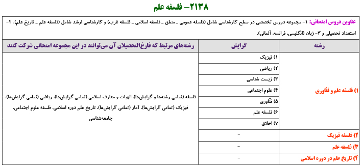 به گزارش پی اچ دی تست، در مجموعه امتحانی «فسلفه علم – 2138»، رشته جدید «فلسفه علم در دوره اسلامی» با شماره ردیف رشته 4 به شرح زیر به فهرست رشتهگرایشها اضافه شد.