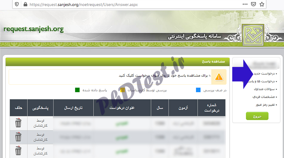 با ورود به سیستم پاسخگویی سایت سنجش، از منوی سمت راست بر روی گزینه «درخواست جدید» کلیک کنید.
