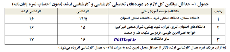 ۱- داشتن حداقل میانگین کل مورد نیاز در دوره های تحصیلی کارشناسی و کارشناسی ارشد (بدون احتساب نمره پایان نامه) به شرح جدول ۱