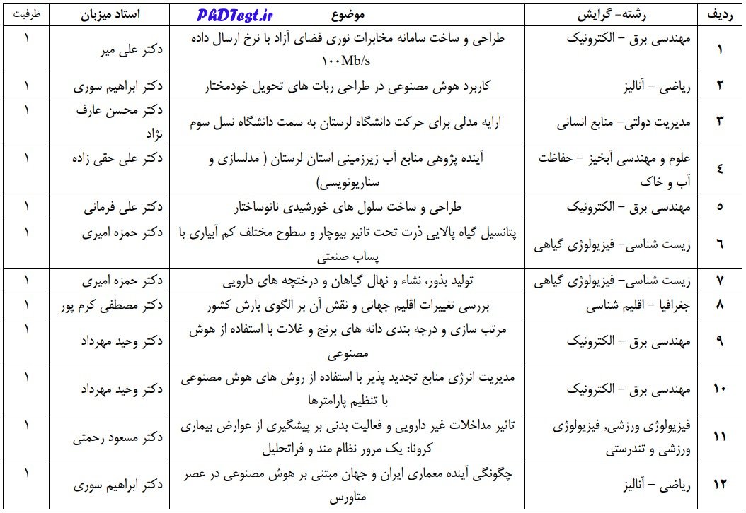 به گزارش پی اچ دی تست، بنا بر اعلام این دانشگاه، دانشگاه لرستان در اجرای آیین نامه پذیرش دکتری استاد محور وزارت علوم، تحقیقات و فناوری در خصوص پذیرش بدون آزمون استعدادهای درخشان به شیوه استاد محور در دوره دکتری در قالب موضوعهای مورد تایید به شرح جدول شماره ۱ و با میزبانی اعضای هیات علمی معرفی شده برای هر یک از موضوعات، از بین دانش آموختگان ممتاز مقطع کارشناسی ارشد که واجد شرایط ذیل باشند، از طریق بررسی سوابق، مصاحبه و بدون شرکت در آزمون، برای سال تحصیلی ۱۴۰۲-۱۴۰۳ دانشجو میپذیرد.