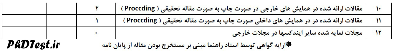 | ۱ | مقالات علمی-پژوهشی (داخلی و خارجی) مرتبط با پایان نامه | ۷ | هر مقاله تا سقف ۷ امتیاز، مطابق جدول ۱-۱ |