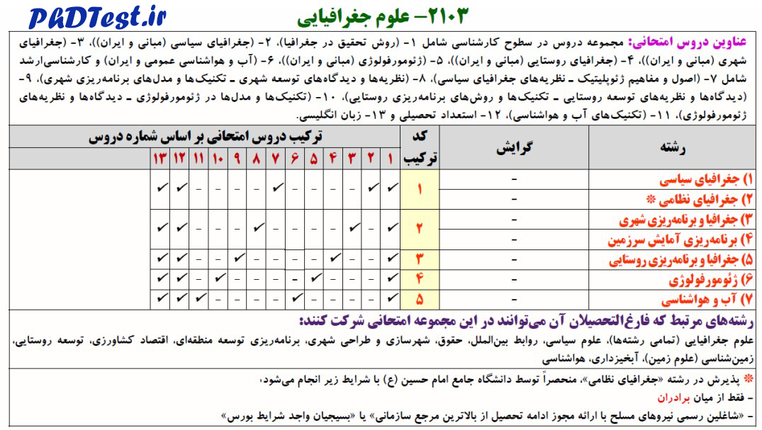 به عنوان مثال متقاضی که در مجموعه امتحانی علوم جغرافیایی با کد ۲۱۰۳ (طبق نمونه ذیل) ثبت نام نموده است چنانچه صرفاً مایل به انتخاب رشته جغرافیای سیاسی یا جغرافیای نظامی است باید به دروس «روش تحقیق در جغرافیا»، «جغرافیای سیاسی (مبانی و ایران)» و «اصول و مفاهیم ژئوپلیتیک – نظریه های جغرافیای سیاسی» پاسخ دهد و متقاضی انتخاب رشته جغرافیا و برنامه ریزی شهری یا برنامه ریزی آمایش سرزمین باید صرفاً به سؤالات «روش تحقیق در جغرافیا»، «جغرافیای شهری (مبانی و ایران» و «نظریه ها و دیدگاههای توسعه شهری – تکنیکها و مدلهای برنامه ریزی شهری» پاسخ دهد.