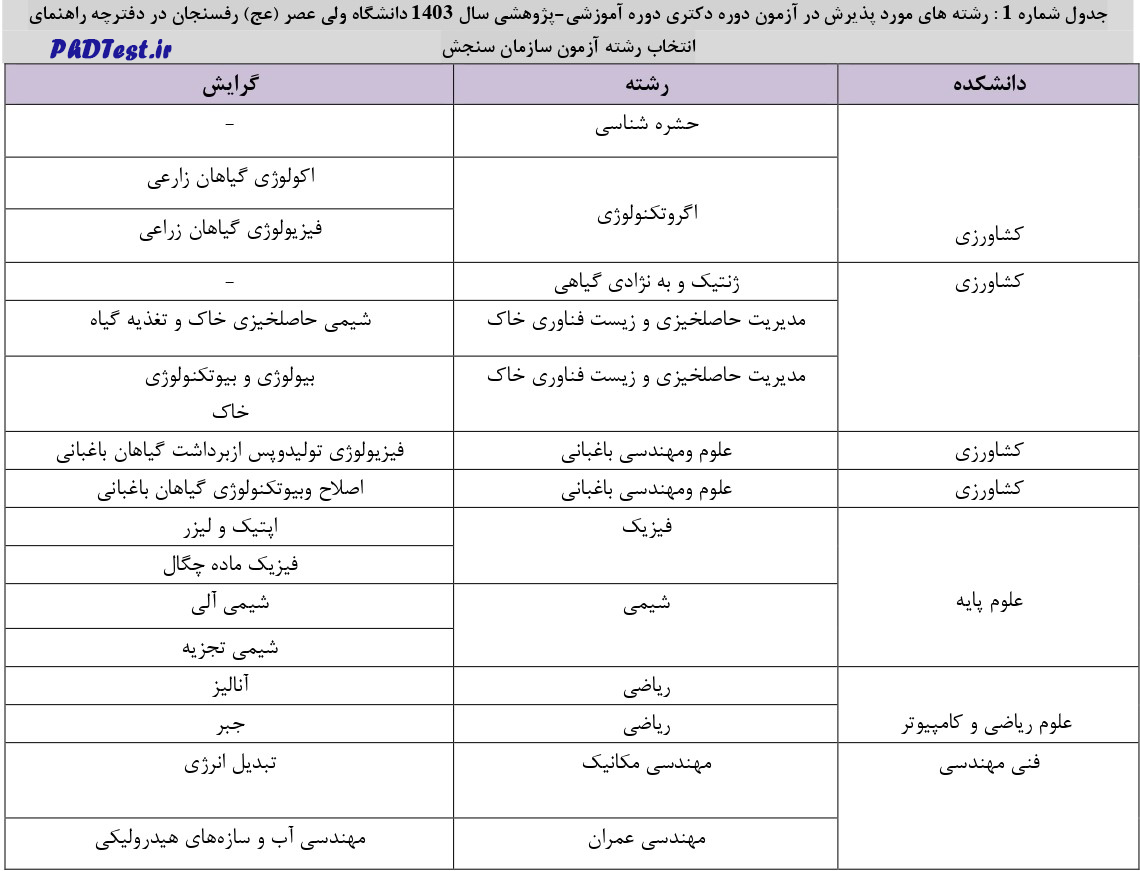 به گزارش پی اچ دی تست، دانشگاه ولی عصر (عج) رفسنجان در سال تحصیلی ۱۴۰۳-۱۴۰۴ از داوطلبانی که حداکثر تا ۳۱ شهریور ماه ۱۴۰۳ در مقطع کارشناسی ارشد فارغ التحصیل شده و یا میشوند، با توجه به ضوابطی که از سوی سازمان سنجش آموزش کشور و تحصیلات تکمیلی این دانشگاه تعیین شده است در رشتههای زیر دانشجو میپذیرد (جدول شماره ۱).