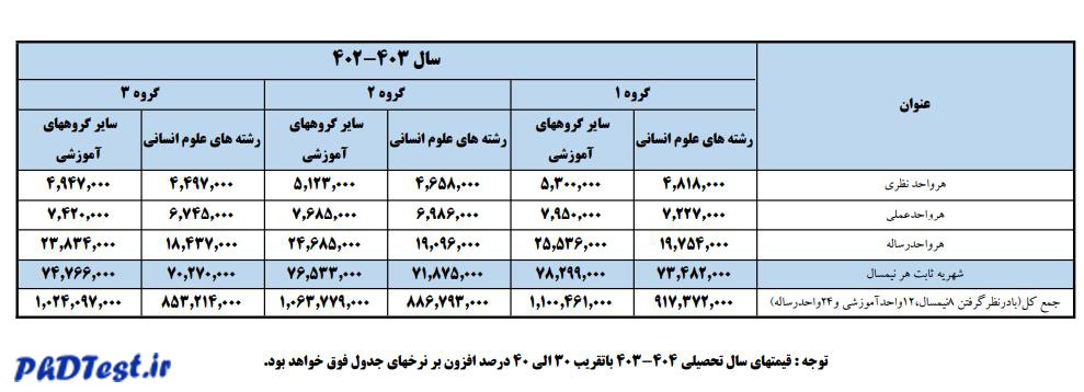 شهریه دوره دکتری در سال ۱۴۰۳ در دانشگاه زنجان برای گروهای مختلف طبق جدول زیر است: