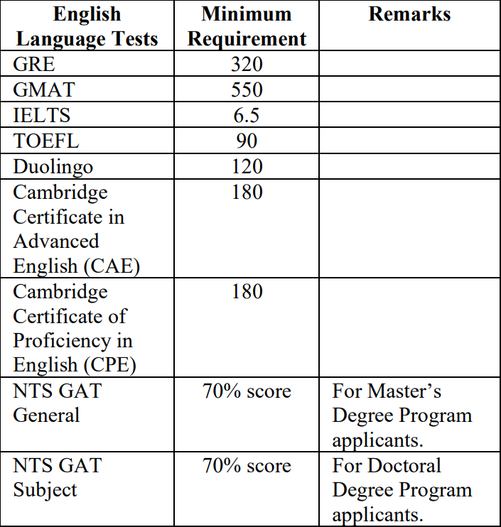 مدارک قابل قبول زبان | GRE, GMAT, IELTS, TOEFL, Duolingo, Cambridge Certificate in Advanced English (CAE), Cambridge Certificate of Proficiency in English (CPE), NTS GAT General, NTS GAT Subject |
