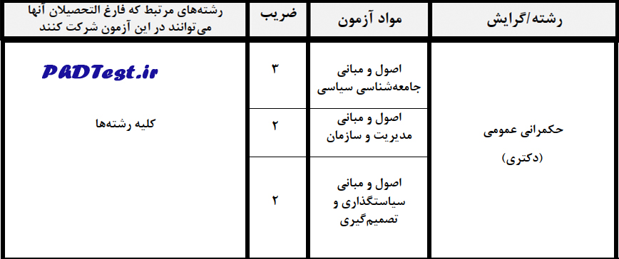 رشته‌های مرتبط و مواد آزمون دکتری مدرسه عالی حکمرانی شهید بهشتی برای سال تحصیلی ۱۴۰۵-۱۴۰۶ به شرح زیر هستند: