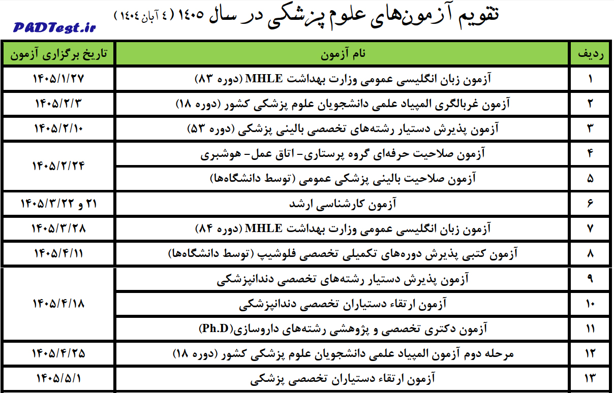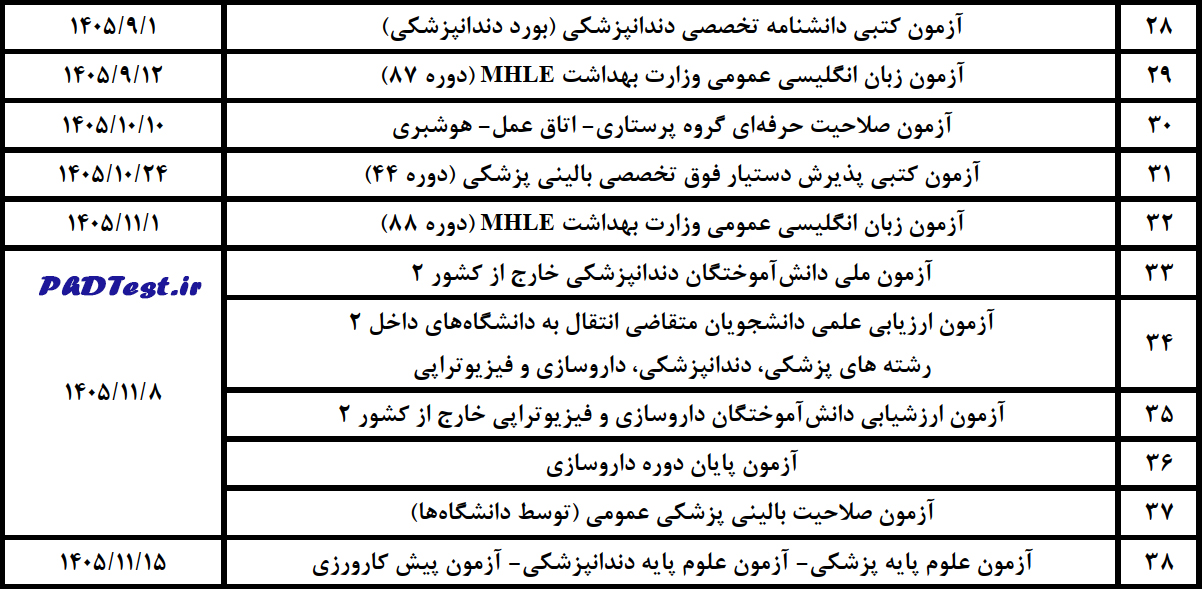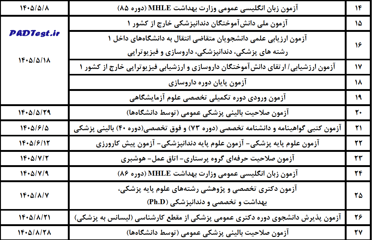 تقویم آزمون های وزارت بهداشت ۱۴۰۵