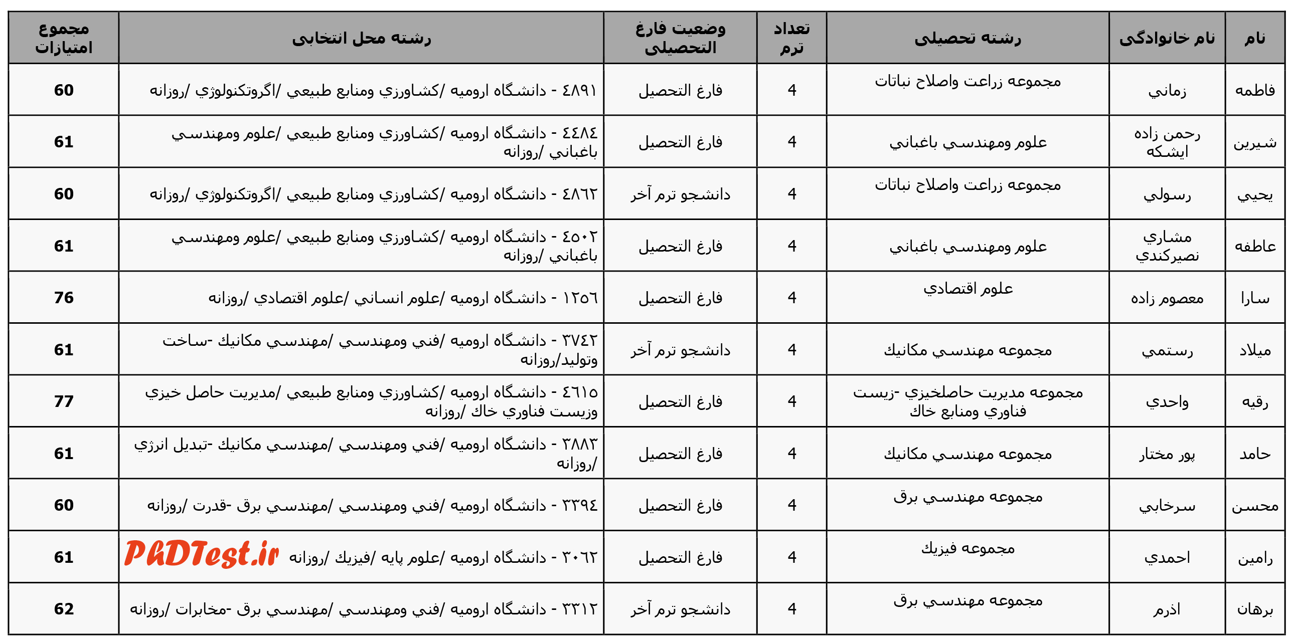 به گزارش پی اچ دی تست، اسامی دانشجویان پذیرفته شده به صورت بدون آزمون با استفاده از سهمیه استعدادهای درخشان در مقطع دکتری تخصصی سال تحصیلی 97-98 دانشگاه ارومیه به شرح زیر است: