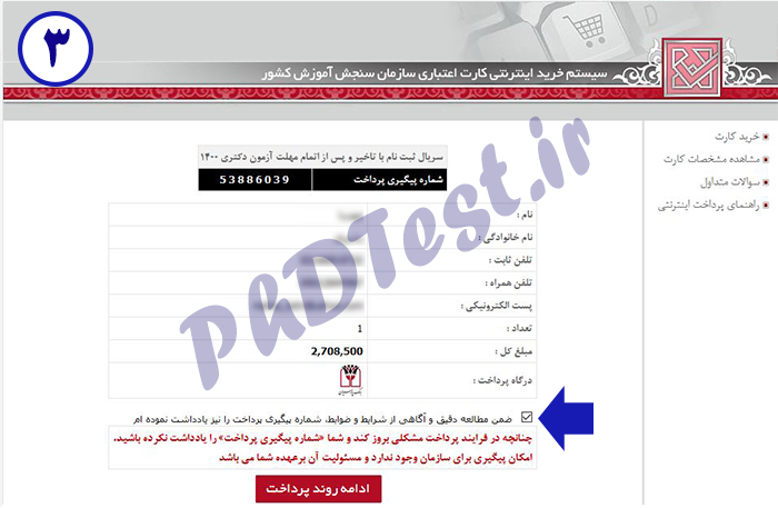 1. در ابتدا لازم است با پرداخت هزینه ثبت نام، نسبت به تهیه کارت اعتباری ثبت نام دکتری اقدام کنید. برای این کار بر روی لینک خرید کارت کلیک کنید.