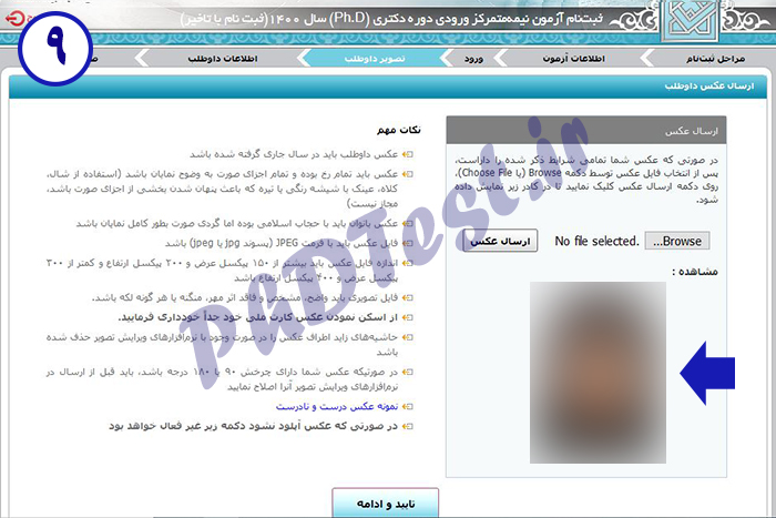 8- یک عکس 3 در 4 مطابق اطلاعات خواستهشده در سایت آپلود کنید و گزینه «ارسال» را انتخاب نمایید.