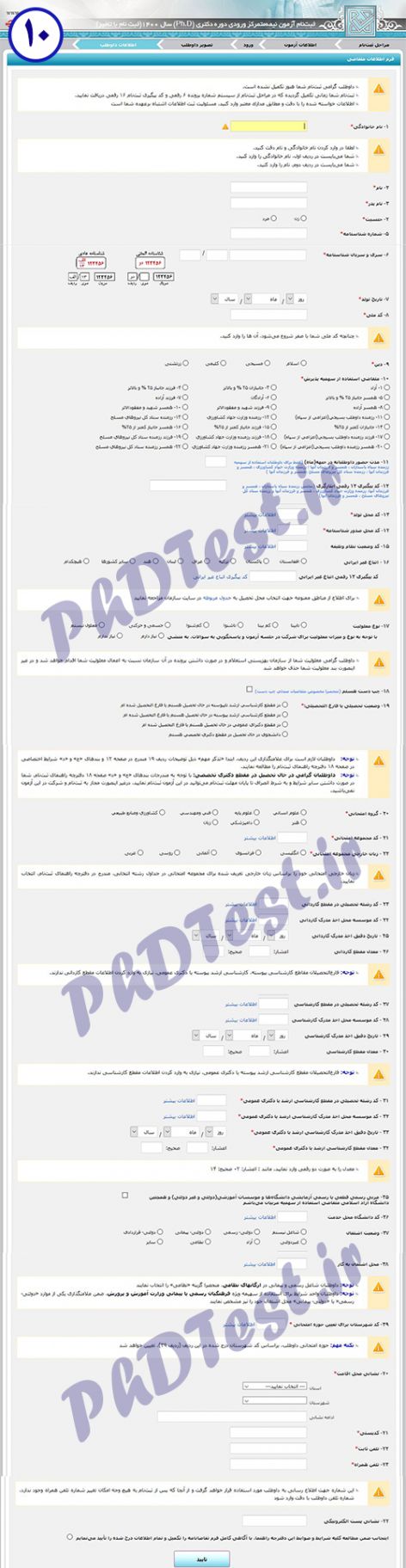 10- همه اطلاعات شناسنامهای و تحصیلی خود را به دقت در فرم زیر تکمیل نمایید. در هر قسمتی که نیاز به کد داشتید، از گزینه «اطلاعات بیشتر» که در مجاور باکس خالی درج شده استفاده کنید.