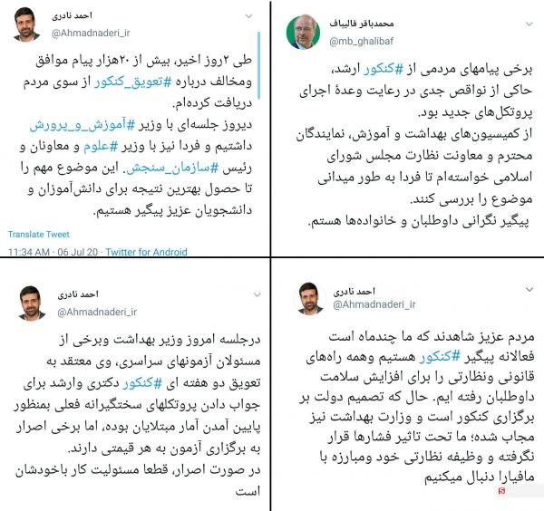 کنکور ارشد ۱۶ و ۱۷ مردادماه و کنکور سراسری از ۲۹ مرداد تا ۱ شهریورماه سال ۹۹ بدون هیچگونه توجهی به پیامها، اعتراضات و توئیتهای رنگارنگ نمایندگان مجلس و اعضای کمیسیون برگزار شد و درحالی که وزارت علوم، سازمان سنجش و حتی ستاد کرونا میزان رضایتمندی از برگزاری کنکور را بالای ۹۰ درصد اعلام کردند، اما صحبتهای داوطلبان و گزارشهای آنها چیزی جز آن میگفت.