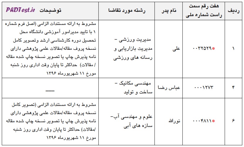 ۱- ضروری است قبول شدگان علمی محترم حداکثر تا پایان وقت اداری روز شنبه مورخ ۱۱ شهریورماه ۱۳۹۶ اصل فرم شماره (۱ گواهی تایید معدل، نمره پایان نامه و…) خود را که در زمان ثبت نام تصویر آن